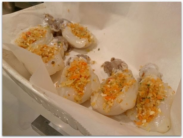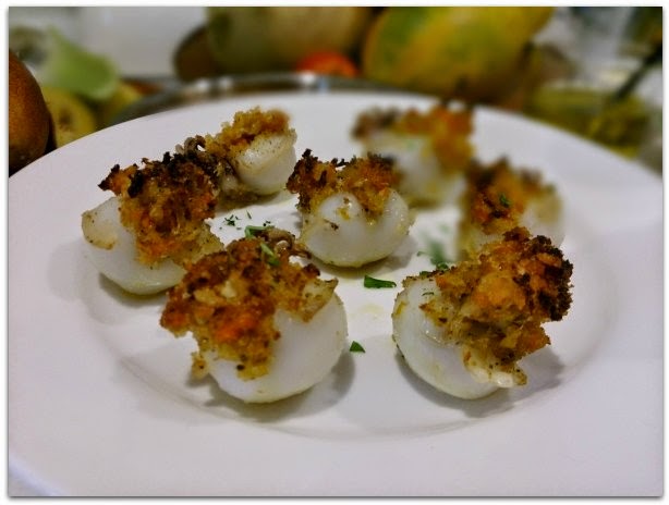 做法:1. 平底鍋內放入橄欖油,油熱後放入大蒜爆香,取出大蒜,放入麵包粉小火炒至金黃色,放涼備用。2. 洋蔥、紅蘿蔔、西芹切細末,以橄欖油中火炒15分鐘,放涼備用。3. 酸豆洗去鹽分切碎,小番茄去皮去籽切碎,鯷魚用牛奶(份量外)洗去鹽分瀝乾切碎,香草植物葉子切細備用。4. 混合以上材料,削入檸檬皮屑及起士屑,以海鹽及胡椒調味,即為鑲餡餡料5. 將小花枝背面身體剖開,將內臟取出清洗乾淨以紙巾擦乾,塞入餡料(如上圖),淋上一點橄欖油,灑上海鹽及研磨胡椒調味,放入烤箱約15分鐘烤熟。6. 烤好後呈盤,擠上檸檬汁,下酒小菜完成!